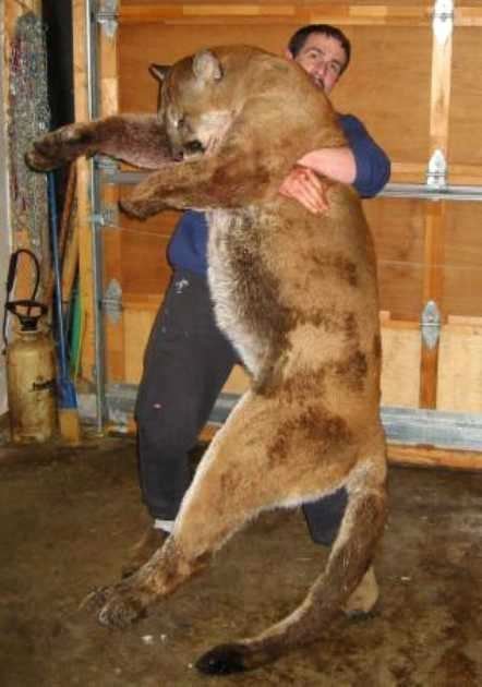 Here is a photo of a cougar killed 5 miles west of Rogers City, Mi.The guy who shot it is 6 foot tall and weighs about 220 lbs. He was in a deer stand and saw the cat pass him downwind. He then saw it pass him upwind.. When the cat passed him again (closer this time) downwind, he knew that it was hunting him. So, boom.