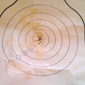 Her first few shots were off, but still hit the paper. As you can see, her last 10 or so chewed up the X ring. Not bad for a first time shooter at 15 feet.