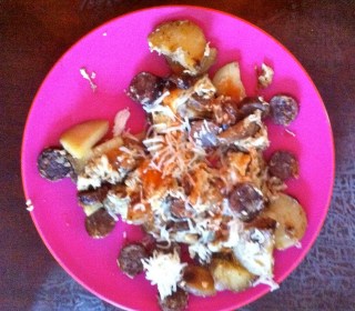 Melt a small amount of bacon grease in the bottom of a cast iron pan, using just enough to wet the bottom of the pan. Cut the sausages into 1/4″ coins and add to the hot pan. Turn several times until all surfaces are browned. Add potatoes and onion, and allow to brown on both sides and heat through to the middle. Add spices to your own taste. Crack eggs into a bowl and beat for scrambling. Pour over potatoes and meat, and stir gently until the eggs are cooked through. Put on plates, sprinkle with cheese, and serve. I douse mine with a bit of hot sauce, but just enough to add some heat, not so much the flavors are overwhelmed.