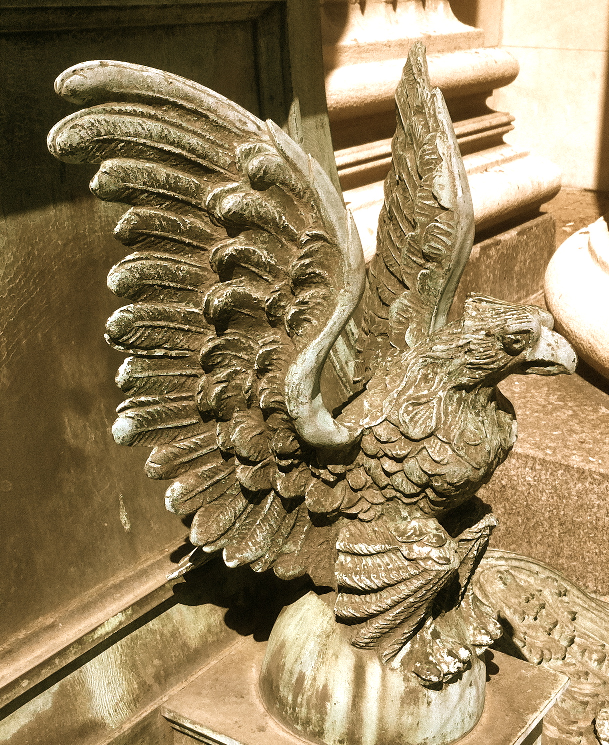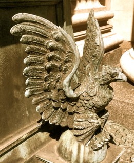 This little fellow is a detail at the bottom of a bronze column on what Irish Woman tells me used to be the main passenger train terminal in Louisville. The verdigris on him is bright green, but I adjusted the saturation a bit to bring out all of the details on him. This isn’t an integral part of the structure, it’s a minor part of decoration that had a lot of time and effort put into it. You don’t see craftsmanship like this on a steel and glass tower.