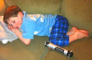 Boo had a “very active and happy” day at school, and he nodded off at 7:30 or so. I put him to bed and he didn’t protest at all. Before dinner, he continued to be both happy and active, and my living room looks like a bomb went off, but it’s mostly just toys and such that I can pick up before going to bed.