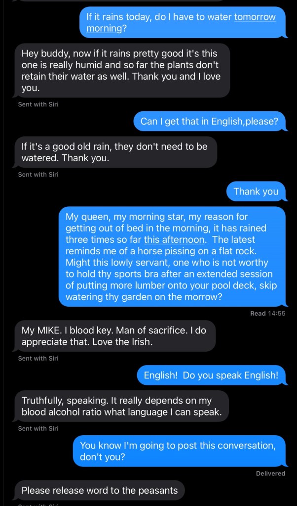 Being the loving husband I am, I acquiesced to her request with nary a complaint. I mean, who am I to argue that dragging a hose around the perimeter of our yard at 6 AM, before both breakfast and coffee, is not something I look forward to?