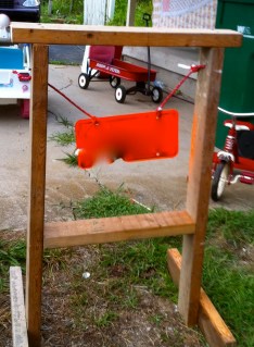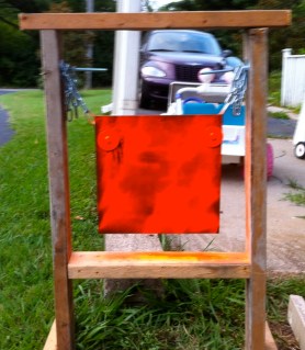 I got to the range at about 8:30 and began lugging target stands out. The new gong went at 50 yards, one of the Shoot-n-See targets went at 100 and another at about 10 yards. The license plate went at 25 yards. As I was bringing my guns and ammunition to the firing line, the RSO told me that the KCR policy for gongs had changed, and my gong had to go out to 100 yards. Apparently they’d had some rebound from gongs getting back to the firing line, so they were pushing them out for safety. I moved the gong, but that ruled out shooting at it with .22’s and pistols for my little group of newbies. That thing was getting high power or nothing today.