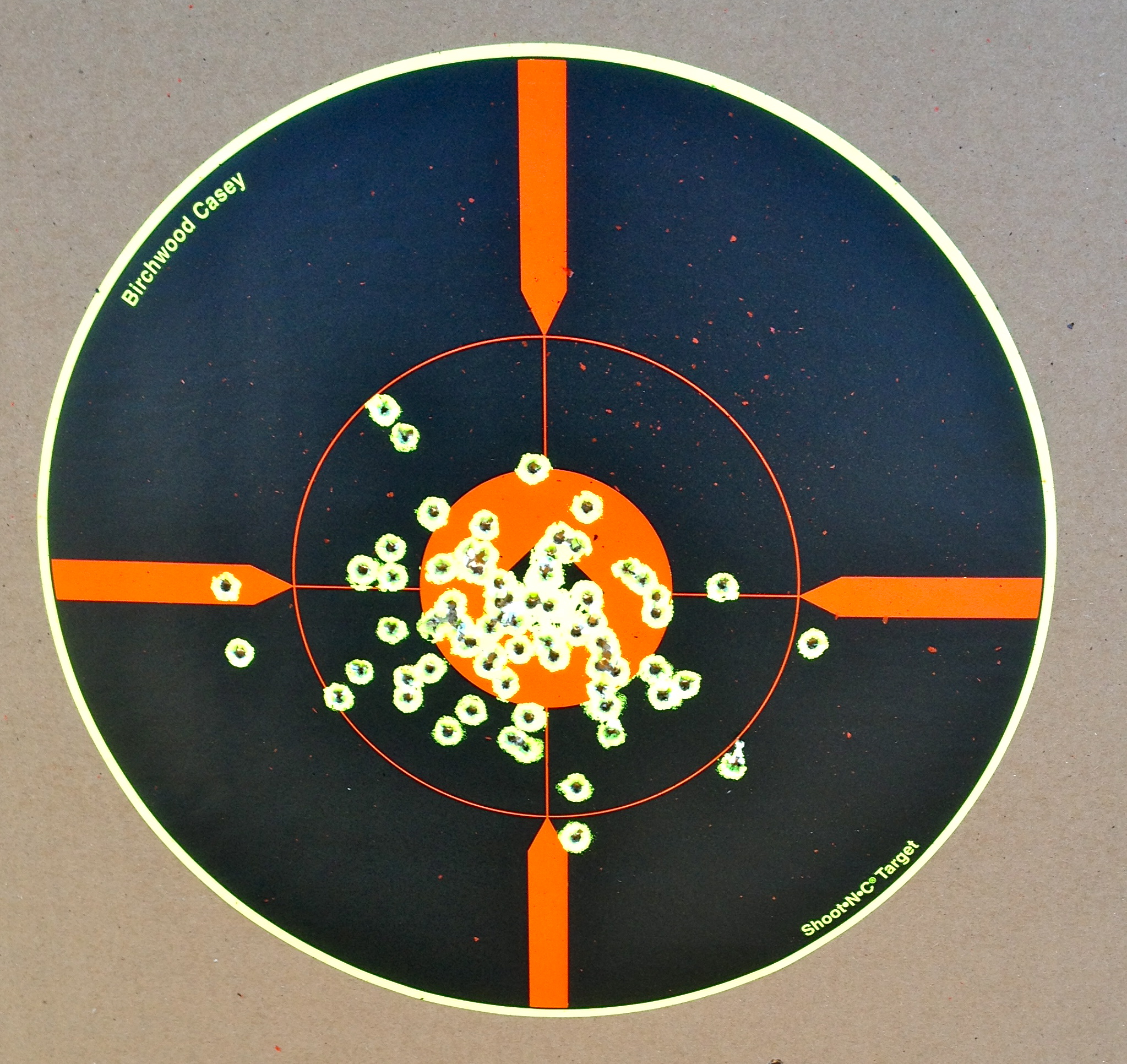 Yeah, it’s full of holes from .30-06 and 7.62x54r, and most 5.56 will go through it, but it, but it does a great job going “ding” when hit with a .22. Knob Creek now lets steel targets come closer than 100 yards when you’re shooting .22, so I think this one will be used as a trainer for Girlie Bear.